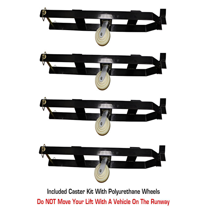 This 4-post lift is your vertical expansion solution. With an 8,000lb capacity and 79" clearance under the runways, you can now work on a car while storing an SUV or pickup above. The 84.25" lifting height maximizes space usage, while the compact 206.75" length keeps your floor plan flexible. At 104.5" wide (without motor), it fits most shop layouts. The 21.25" wide runways with 37" between them ensure stability and accessibility for various vehicle sizes. Powered by a standard 110-volt system, it's easy to integrate into your existing setup. Included plastic drip trays and a steel jack tray mean you're ready for any job. Don't let vertical limitations cap your business growth - let the Atlas® Garage PRO8000EXT elevate your shop's projects.